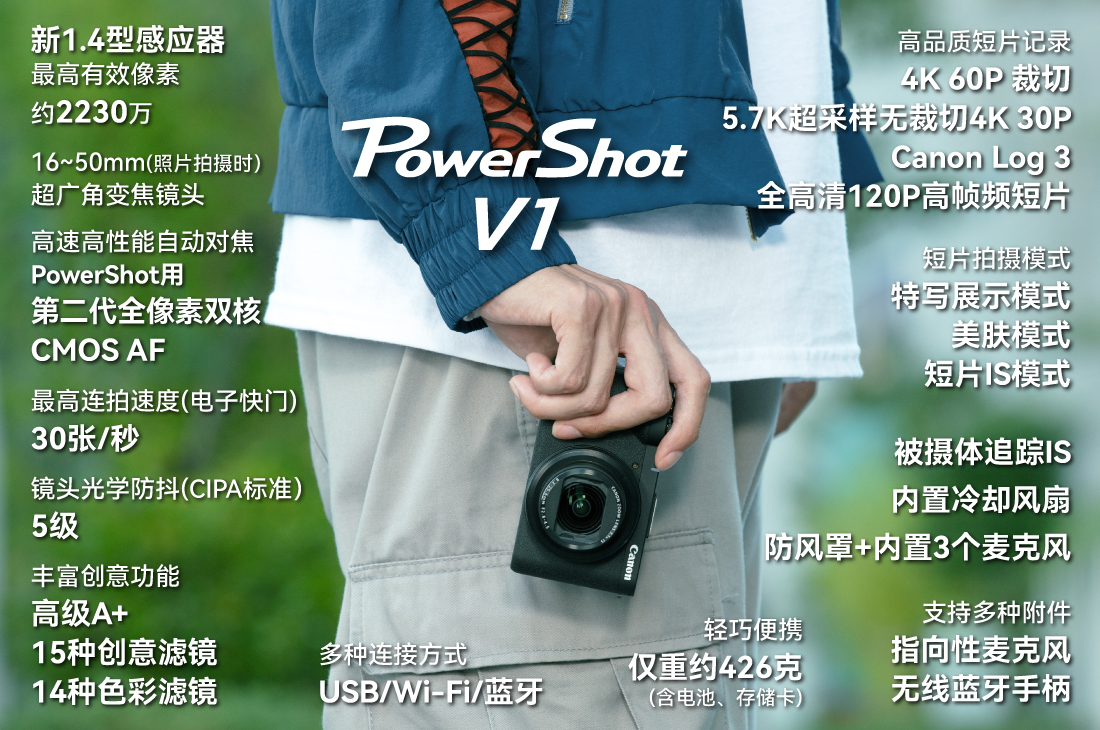随身视频机PowerShot V1搭载了适合短片拍摄的一体化超广角变焦镜头和新开发的1.4型CMOS图像感应器,支持专业配置并内置冷却风扇,不仅画质出色且稳定可靠。同时PowerShot V1外观简洁大气、相比可换镜相机其小巧轻便,便于随身携带。无论是视频博主记录扫街、探店或颜值自拍,还是个人主播进行带货直播,又或视频行业从业者作为工作备机及媒体记者进行视频记录报道,PowerShot V1都可轻松应对。此外,这款随身视频机也具备出色的拍照表现,让短片和照片拍摄超越视界,呈现世界精彩真实的一面。