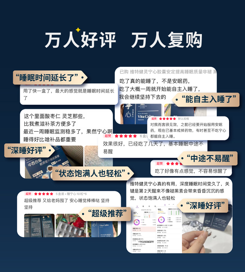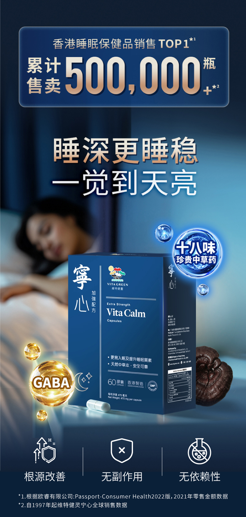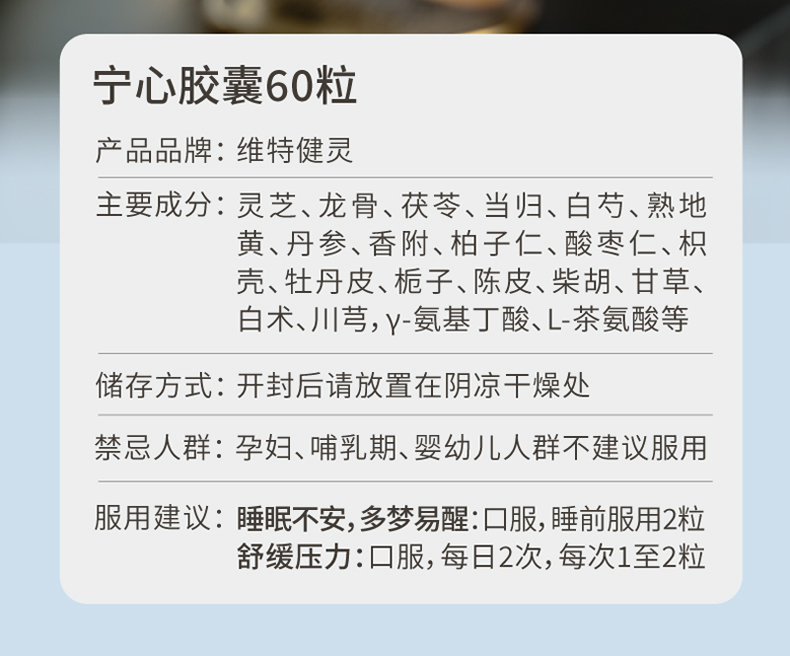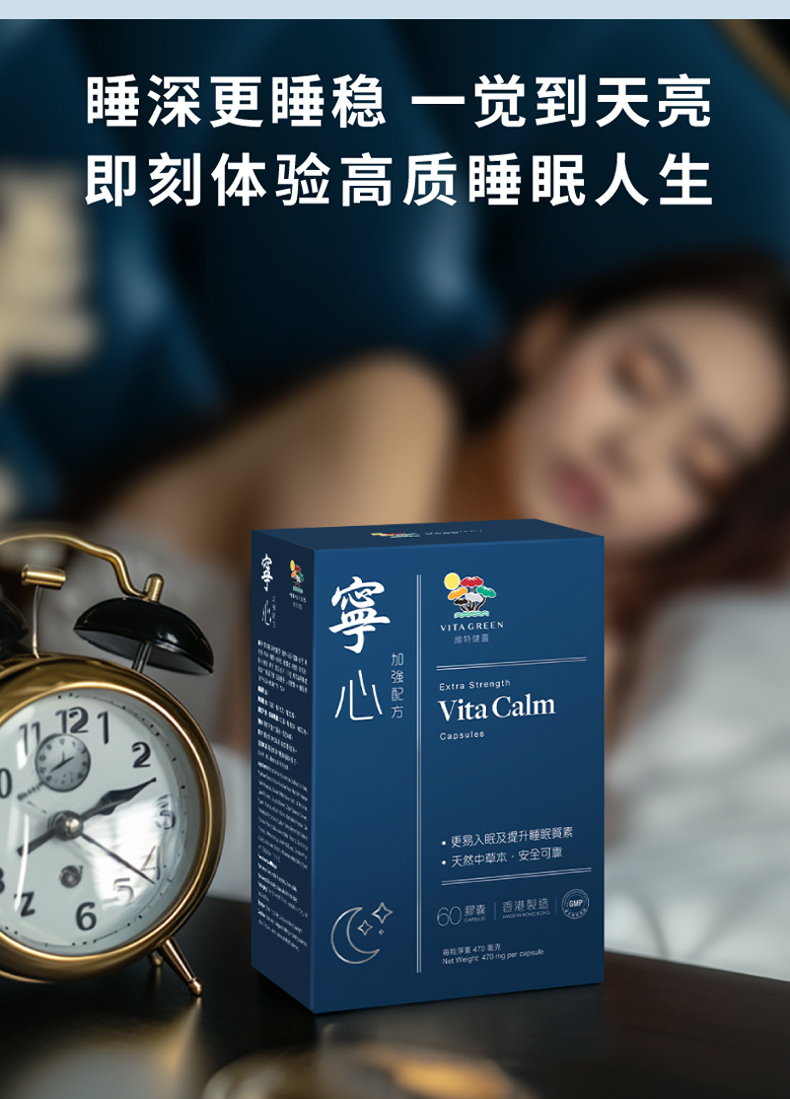 维特健灵宁心胶囊于1997年上市,专为压力难眠人士研发,已连续4年成为香港睡眠保健产品销售NO.1。18味中草本与西式助眠因子GABA深层改善睡眠质量,L-茶氨酸舒缓压力与紧张情绪,是根源调理睡眠的不二之选。