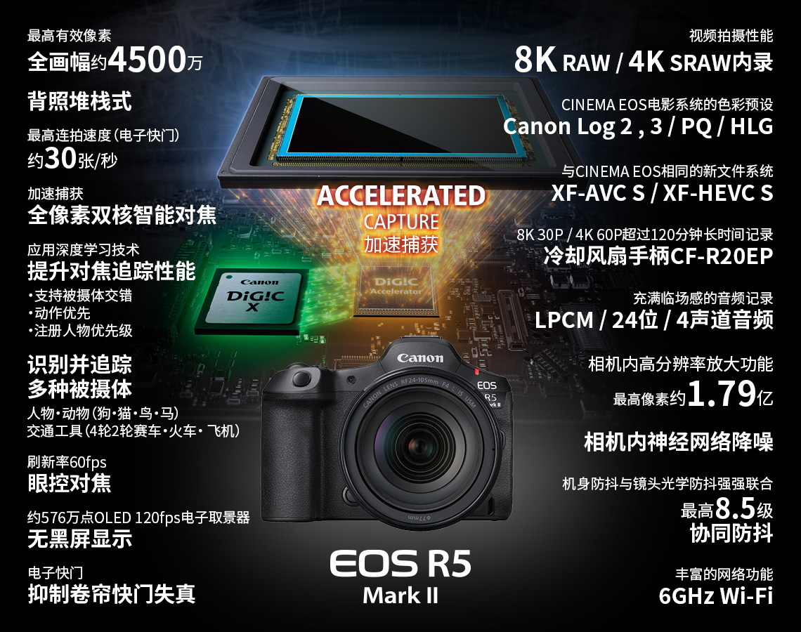 EOS R5 Mark II,导入了EOS历史上最强悍的影像处理系统 “Accelerated Capture(加速捕获)”。